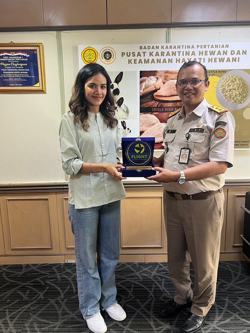 Nabila Fatma as the Director of Communication of FLIGHT was presented a placard to the Head of the center for Animal Quarantine and Biosafety, Wisnu Wasisa Putra,DVM., M.Sc as a form of appreciation for the commitment and active role of the Indonesian Quarantine Agency in enforcement and saving plants and wildlife especially Birds in Indonesia.